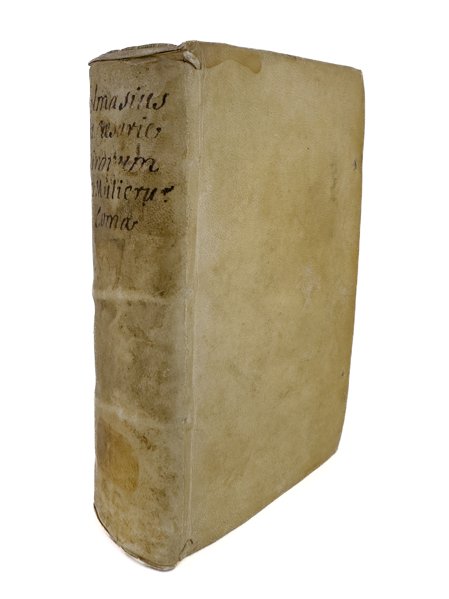 Leyden: Ex Officina Elzeviriorum, 1644. Sm. 8vo. 748pp. Title printed in red & black with publisher’s woodcut device. Cont. vellum, hand lettered spine (a bit soiled). Armorial bookplate on front pastedown. A fine copy.. In this work Salmasius attacks the fashion popularized by Louis XIII of long hair for men. Willems #580.