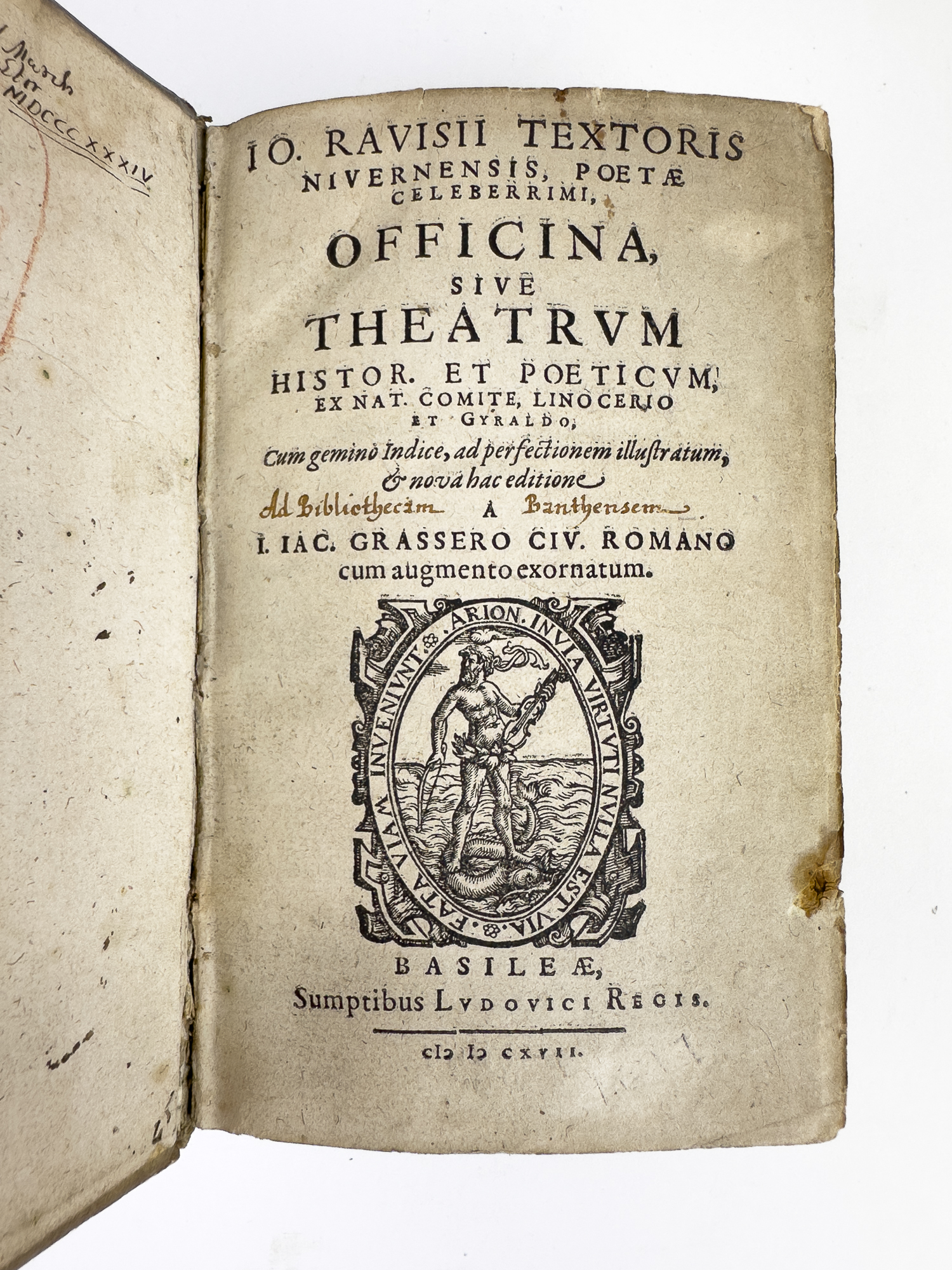 Tixier, Jean (or, Ravisius Textor, Joannes). OFFICINA, SIVE THEATRUM HISTOR. ET POETICUM… cum Gemino Indice, ad Perfectionem Illustratum & Nova Hac Editione a I. Jac. Grassero… cum Augmento Exornatum
