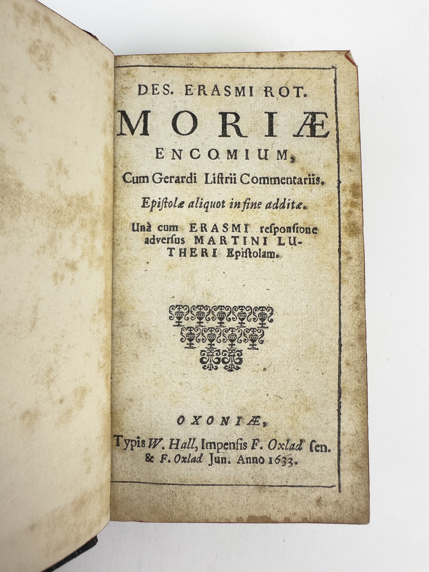 Erasmus, Desiderius. MORIAE ENCOMIUM, cum Geraldi Listrii Commentariis. Epistolae Aliquot in Fine Additae. Una cum Erasmi Responsione Adversus Martini Lutheri Epistolam