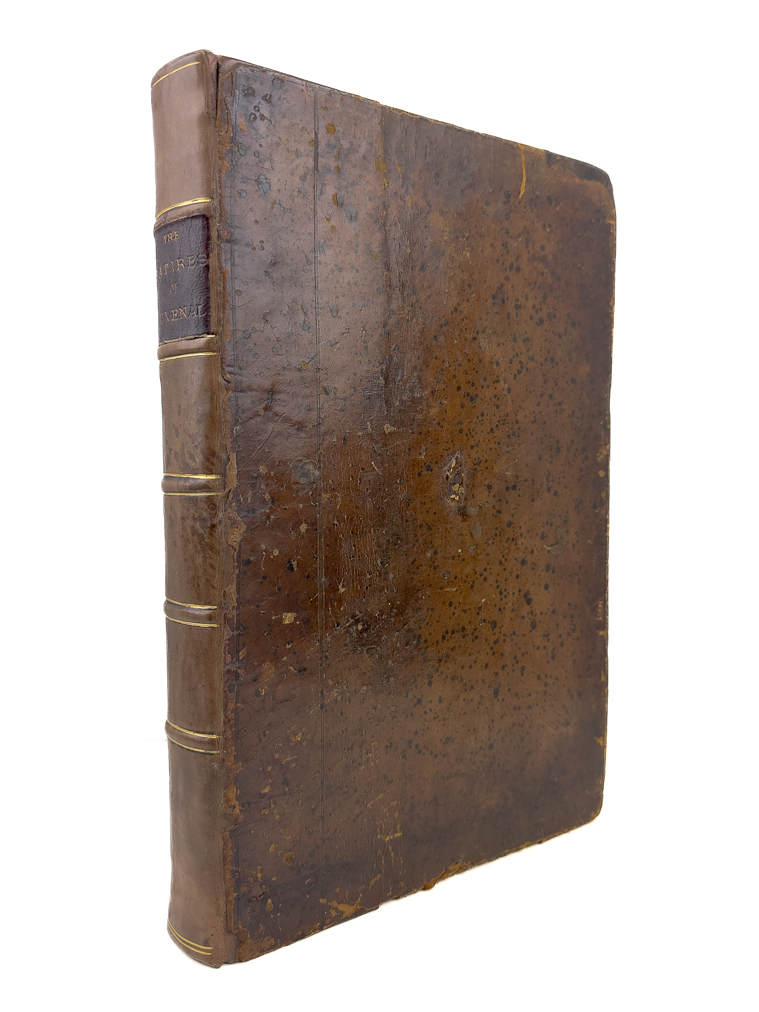 London: Printed for Jacob Tonson, 1693. Folio (12-3/4” x 8-3/4”). 2 parts in 1, each with a title-page. Each of the satires is preceded by its own half-title and followed by explanatory notes. Orig. speckled calf, worn, rebacked, orig. brown morocco spine label laid back down. Repair to the fore-margin of the title affecting the ruled border and one letter. Tiny bookplate on front pastedown.. The first edition of the John Dryden (1631-1700) translation. Wing J1288.