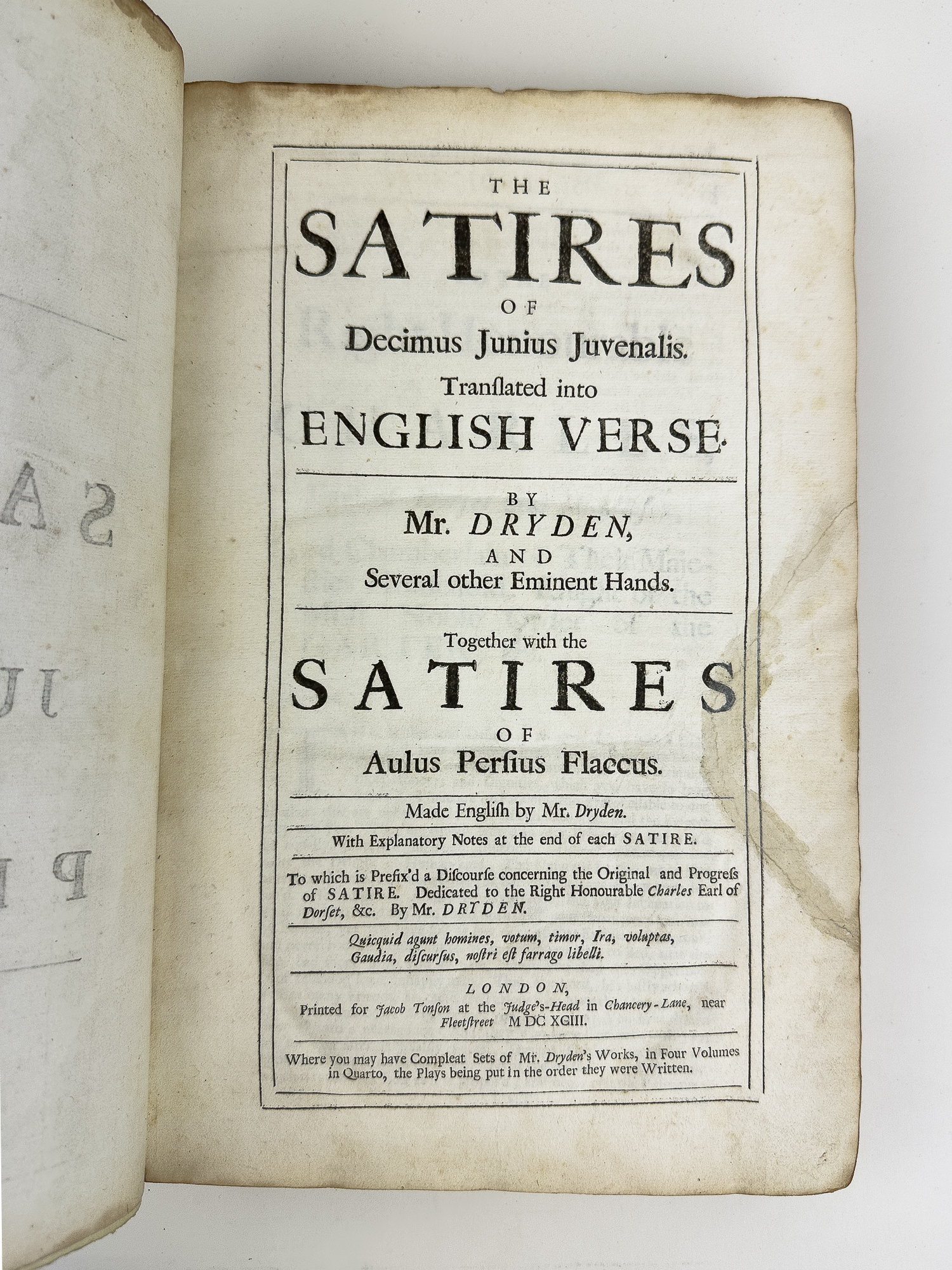 THE SATIRES OF DECIMUS JUNIUS JUVENALIS. Translated into English Verse. By Mr. Dryden, and Several Other Eminent Hands. Together with the Satires of Aulus Persius Flaccus. Made English by Mr. Dryden… To Which Is Prefix’d a Discourse Concerning the Original and Progress of Satire… by Mr. Dryden.