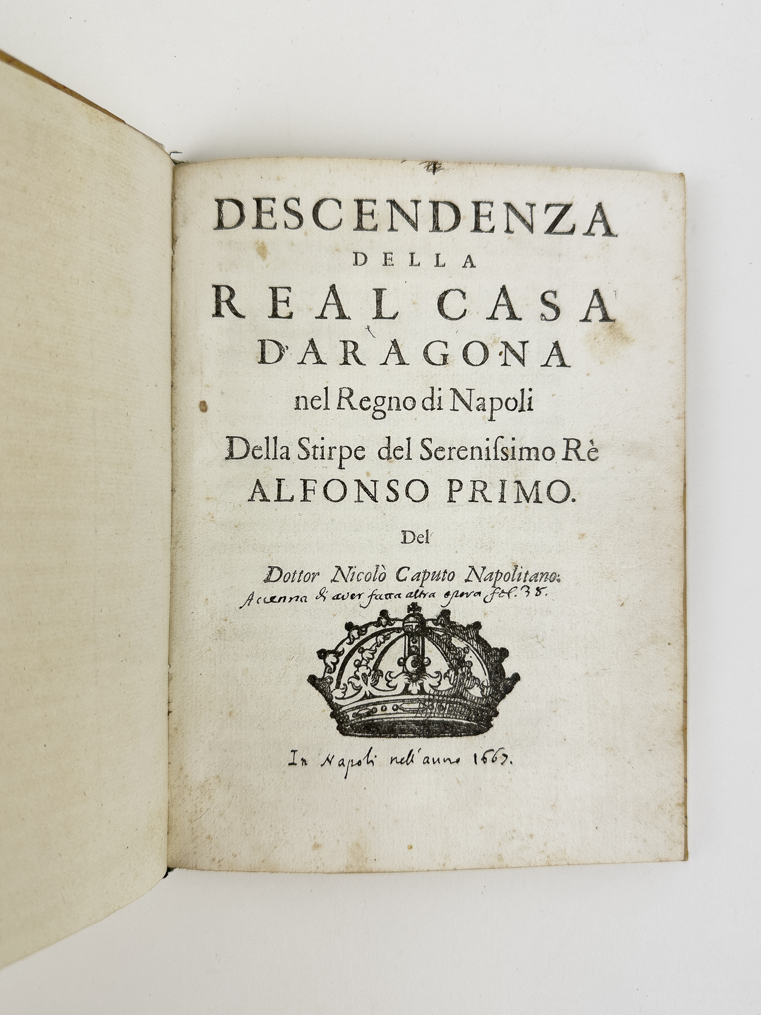 No place (but Naples): No pub, 1667. Sm. 4to. 84pp. Woodcut royal crown on title page. Modern vellum spine, gilt, over marbled boards. Some light foxing. A few inked marginal notations in several neat contemporary hands.. Genealogy of the House of Aragon. The first edition. This book was also published in French in the same year, and in English in 1668.