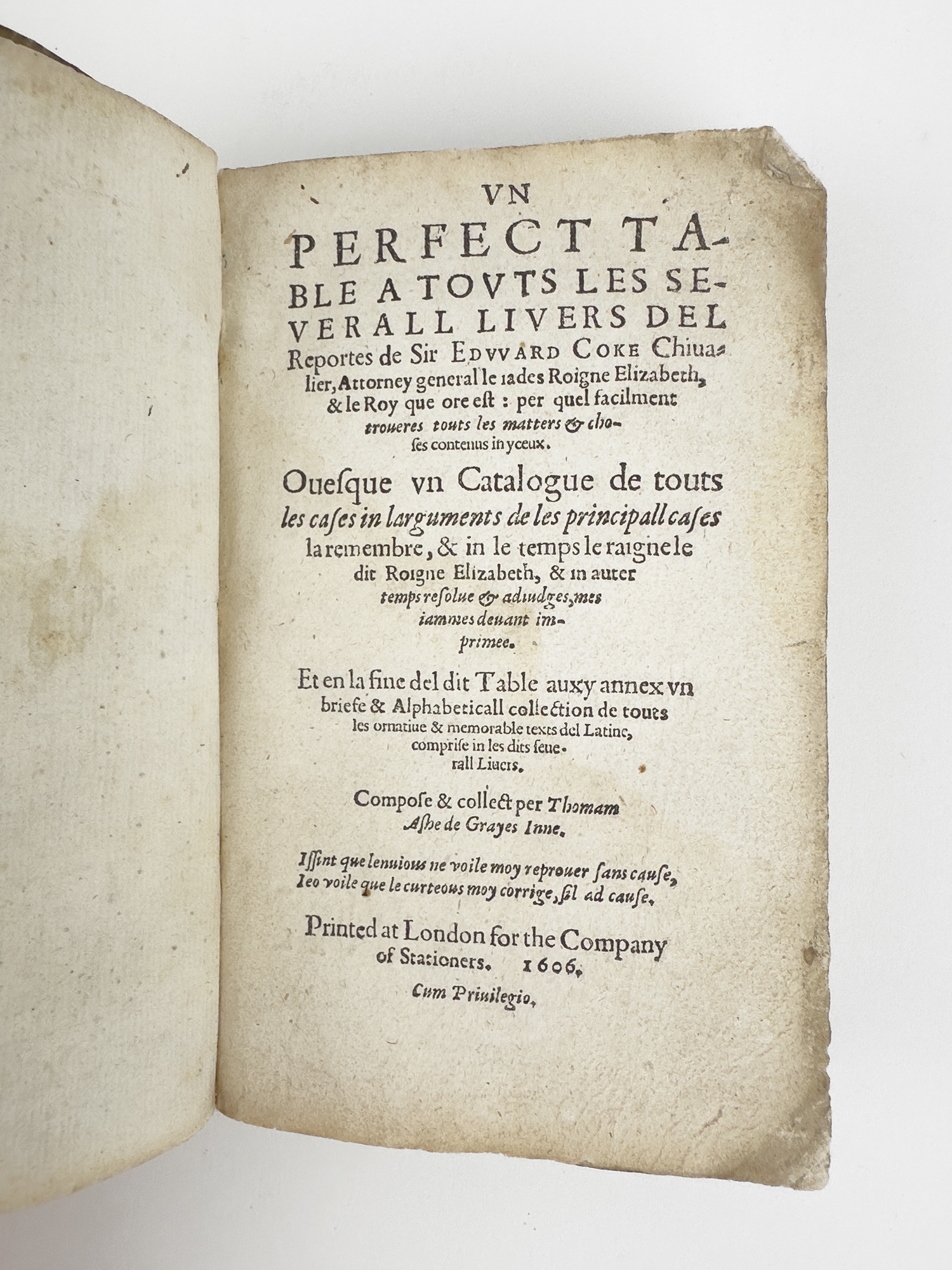 London: (Adam Islip) for the Company of Stationers, 1606. Sm. 8vo. ff.(16),148. Orig. limp vellum, soiled. Some old faded water stains to text, but overall very good, with occasional marginalia.. Scarce first edition. Indices for cases and subject matter covered in the REPORTS of Sir Edward Coke. STC 5525.