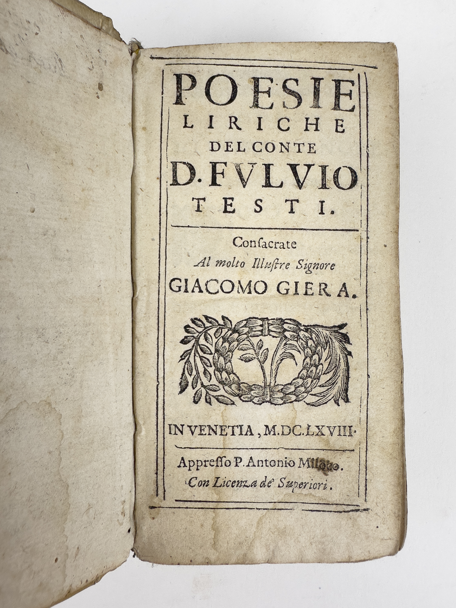 Venice: P. Antonio Miloco, 1668. 12mo. 2 parts in1, each with a title page, but paginated continuously. 738pp. Cont. vellum.. The collected poems of Testi (1593-1646).